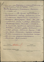 За время пребывания в отряде участвовал в боях с немецкими оккупантами, в уничтожении телефонно-телеграфной связи, два раза в рельсовой войне, в разборе узкоколейного железнодорожного полотна и мостов, в перекопке грунтовых шоссейных дорог. Работал поваром роты, к своей работе относился хорошо, в трудное время обеспечивал партизан питанием. В боях с немецкими оккупантами показал себя смелым, дисциплинированным, морально устойчивым. Ходил на обстрел из ПТР воинских эшелонов противника, вследствие чего на своем счету имеет 2 пробитых и выведенных из строя вражеских паровоза на перегоне Пинск – Юхновичи.