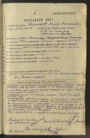 Во время пребывания в партизанском отряде отличился в подрыве вражеских эшелонов. Подорвал 7 вражескихэшелонов.В результате подрыва разбито 6 паровозов, 7 платформ с автомашинами, 70 вагонов с живой силой, с техникой – 33, разбито 17 автомашин, убито 750 гитлеровцев, ранено 360 чел. Отличился 14 09.1943г.при разгроме Блоньского вражеского гарнизона:первым ворвался в караульное помещение №1,где взяли в плен 8 полицейских, 8 винтовок и боеприпасы. Как командир энергичный, смелый,инициативный.