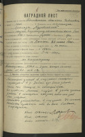 За время пребывания в бригаде “Буревестник” ко всем поручениям командования относился добросовестно и аккуратно. Своим личным примером в боях показал себя смелым, мужественным и бесстрашным бойцом. В боях в дер. Танкагевич (название неразборчиво) 4.04.1944 г. убил 3 нем. Солдат и подобрал трофеи.