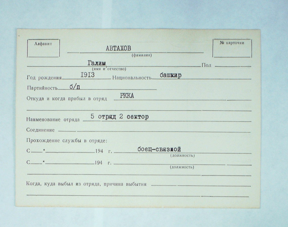 Галин Хабиб Аширович (Ашрафович), 1917 года рождения, башкир, прибыл в отряд из РККА Судакский десант. Наименование отряда: 5 отряд 6 бригады. Прохождение службы: с 10.01. по 15.03.1942 г. – боец отряда Алдарского, с 15.03. по 20.10.1942 г. – боец отряда Незамова, с 20.10.1942 г. по 20.04.1944 г. – адъютант штаба. Награжден медалью «Партизан Отечественной войны II степени» 04.05.1945 года;