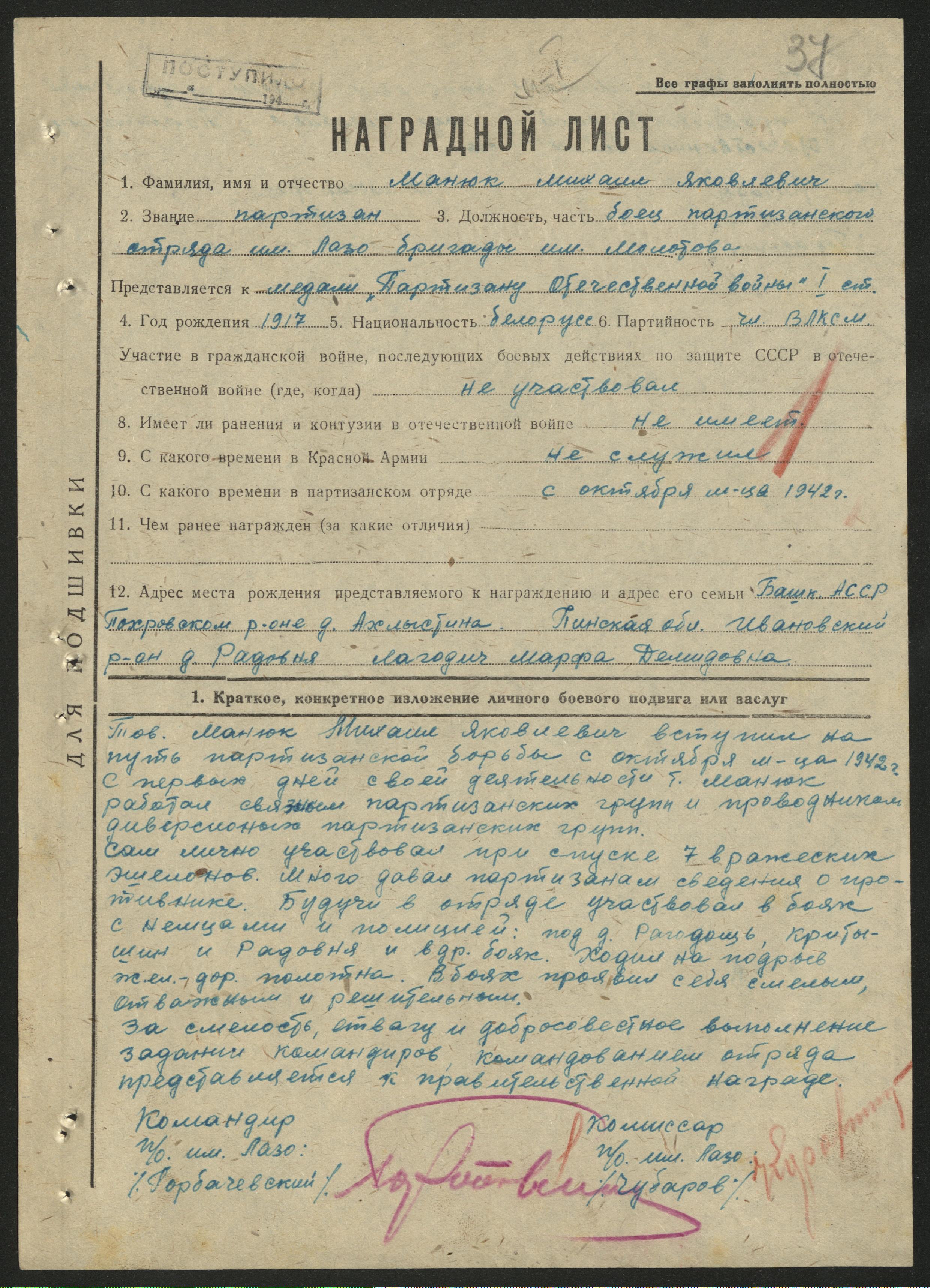 Если вы знаете о послевоенной жизни Михаила Яковлевича Манюка, его семье (возможно, жена — Лагодич Марфа Демидовна, проживала в годы войны в д.Радовня, Ивановского района Пинской области (с 1954 года входит в состав Брестской области) Белоруссиия), месте жительства после 1944 года — пожалуйста, поделитесь информацией с создателями базы данных «Фронт в тылу врага» по почте: info@partizany-bassr.ru либо в комментариях к этой публикации.