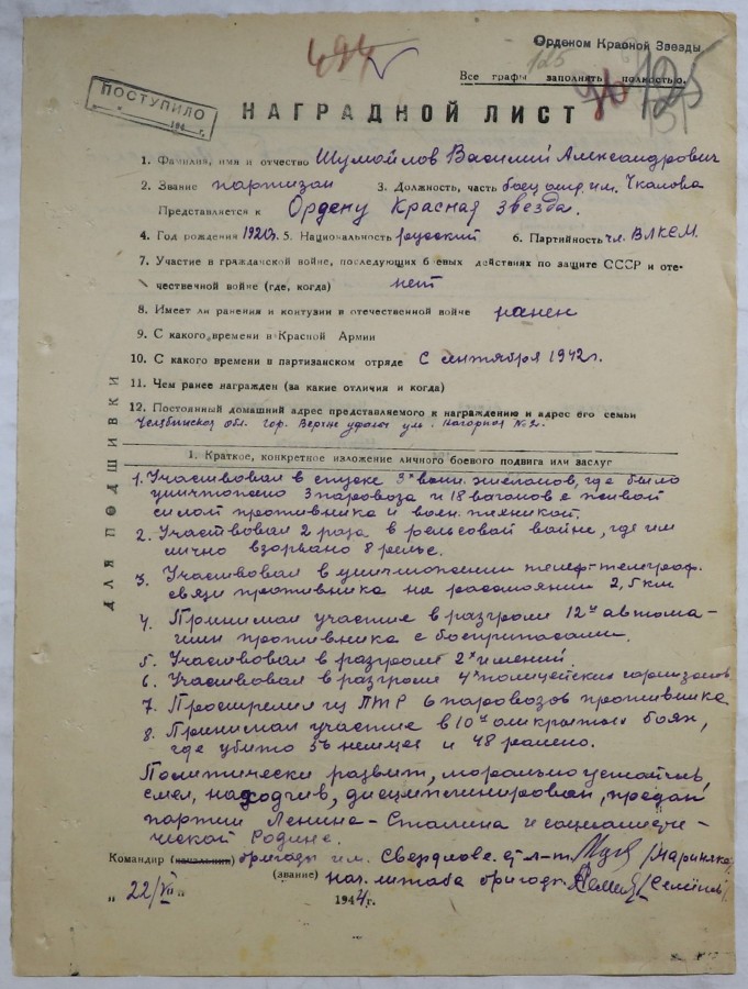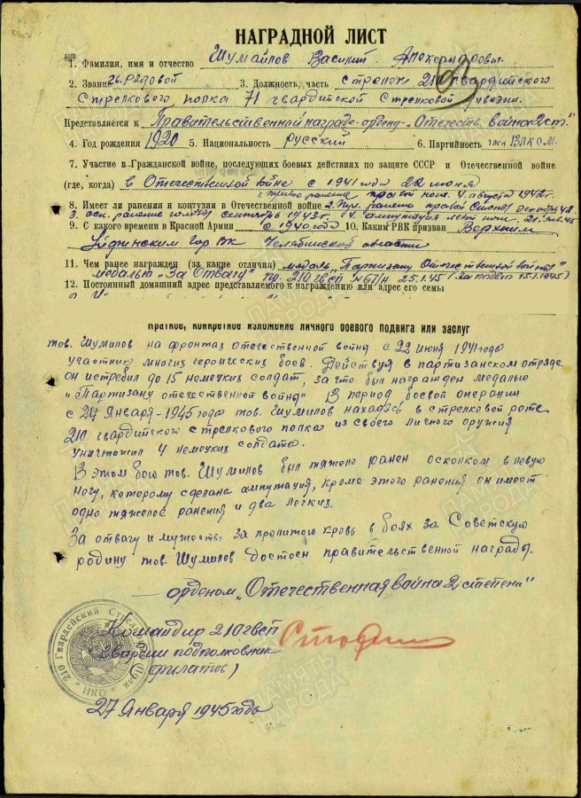 Гвардии красноармеец 210-го гвардейского стрелкового полка 71-й гвардейской стрелковой дивизии Василий Шумайлов воевал на 1-м Прибалтийском фронте. Опытный солдат одним из первых поднимался в атаку, стойко сражался с врагами. За личное мужество и героизм был награжден медалью “За отвагу” . 21 января 1945 года Василий был тяжело ранен в бою. Командир полка представил солдата к награждению орденом Отечественной войны второй степени. Командир 2-го стрелкового корпуса, в состав которого входила дивизия, Герой Советского Союза гвардии генерал-майор Баксов А.И. повысил статус награды и принял решение наградить красноармейца Шумайлова В.А. орденом Красного Знамени.
