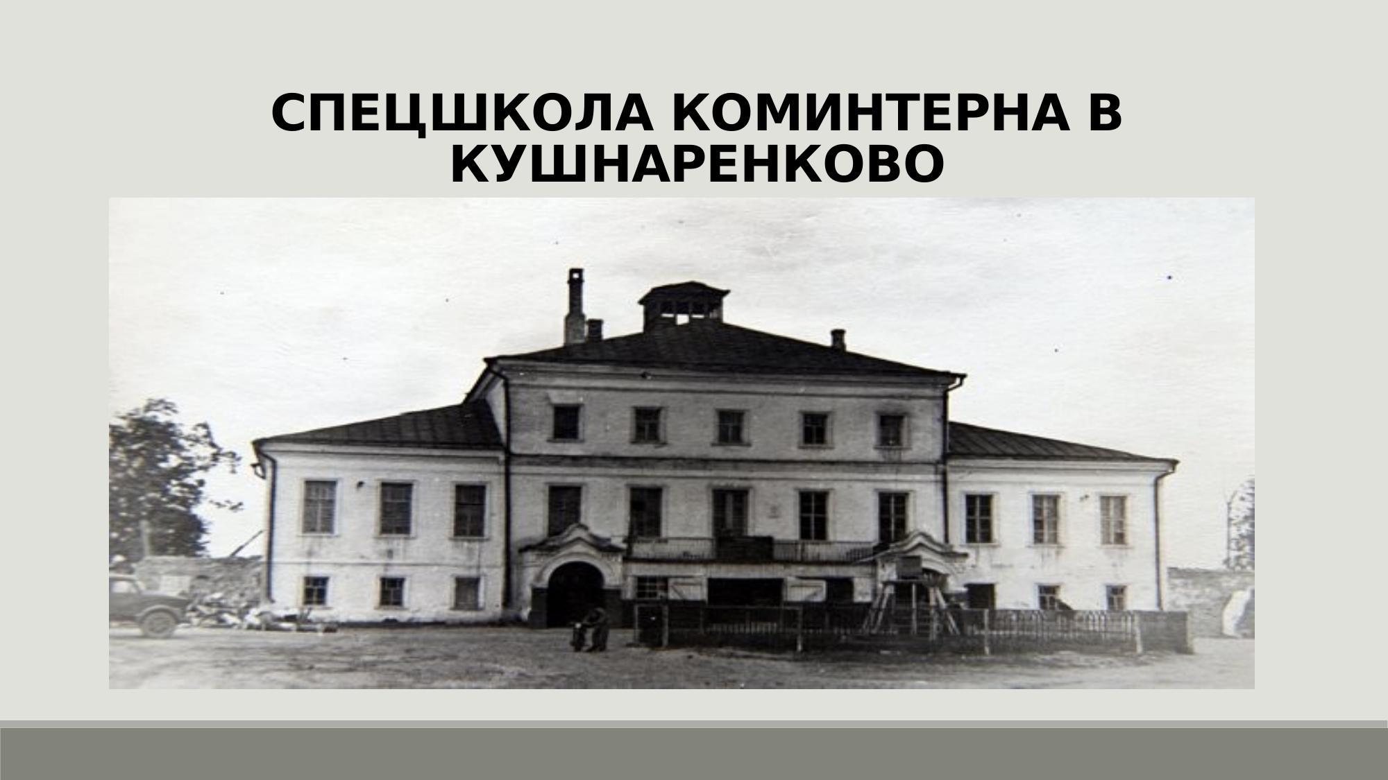 26 октября 1941 года на территории села Кушнаренково заработала единая специальная партийная школа Коминтерна, готовившая разведчиков для работы на оккупированных фашистами территориях СССР, Восточной и Западной Европы. Вторая школа для подготовки радистов работала в Уфе (директор Н. Тяпкин).