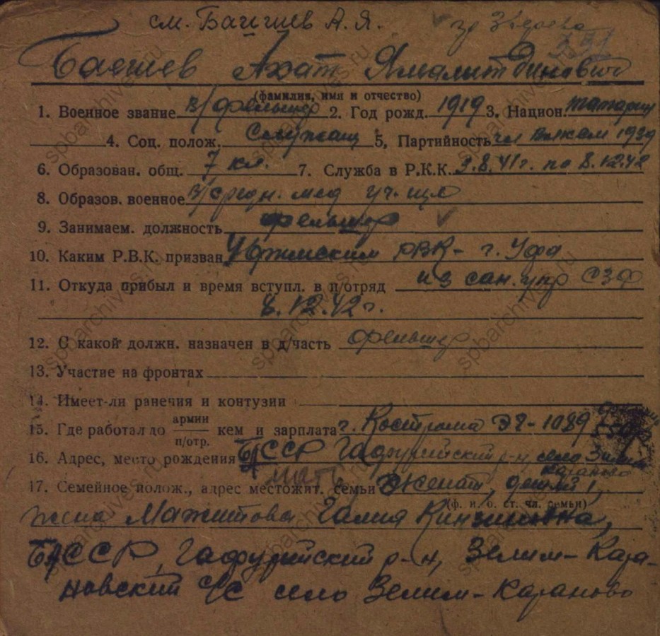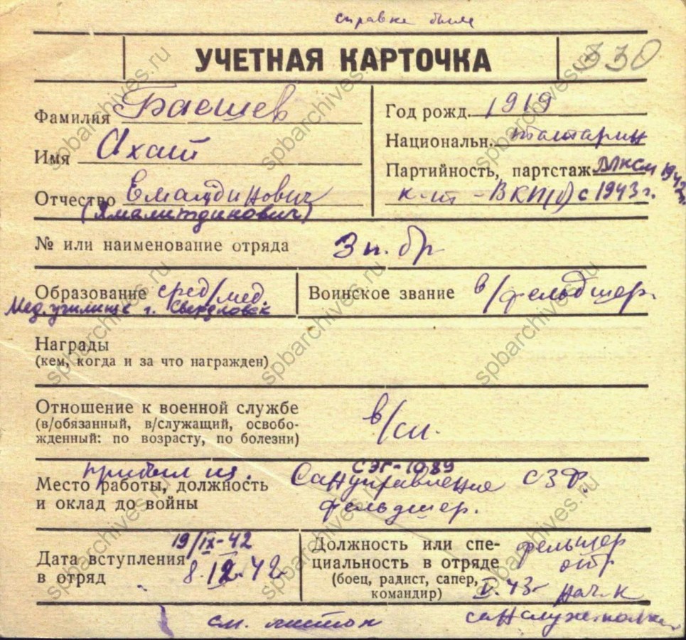 Старший преподаватель кафедры «Наземные транспортно-технологические комплексы» Петербургского государственного университета путей сообщения к.т.н. Мигров Александр Алексеевич поделился с создателями мультимедийной базы данных «Фронт в тылу врага» архивными материалами о фельдшере 3-ей Ленинградской партизанской бригады Баишеве Ахате Ямалетдиновиче: карточками Ленинградского штаба партизанского движения из архива ЦГАИПД СПб и фотографией из памятного альбома бригады, что позволяет более полно представить его героический путь и вклад в борьбу с врагом.
