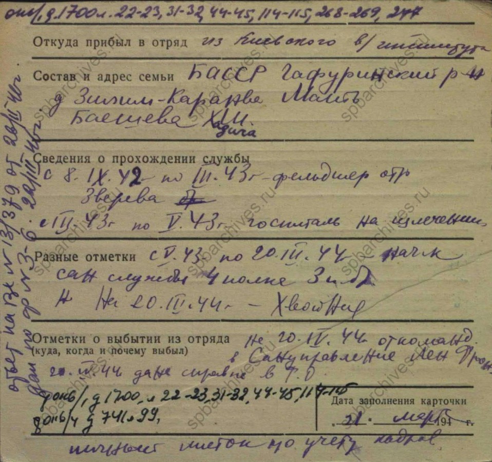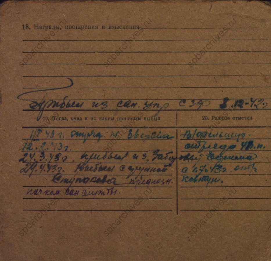20.04.1944 г. откомандирован в Сануправление Ленинградского фронта.