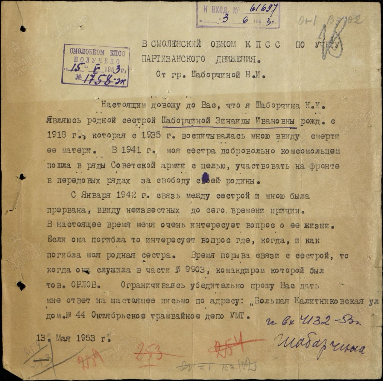 В мае 1953 г. родная сестра Зины Наталья Ивановна Шабарчина писала в Смоленский обком КПСС с просьбой уточнить судьбу младшей сестры — связь оборвалась ещё в январе 1942-го. Смоленский областной партийный архив в июне 1953 г. отправил в адрес Московского облисполкома письмо, где сообщалось, что по неофициальным данным учетной карточки, не подписанной командованием, в архиве есть сведения о Шаборшиной Зинаиде, которая 26 августа 1942 г. убита в разведке около деревни Старое Лавшино Жуковского района. Похоронена там же. Первым о Зинаиде написал известный краевед из Калтасинского района Роберт Шакиртов (Газета “Калтасинская Заря” № 104 от 30 декабря 2021 г.).