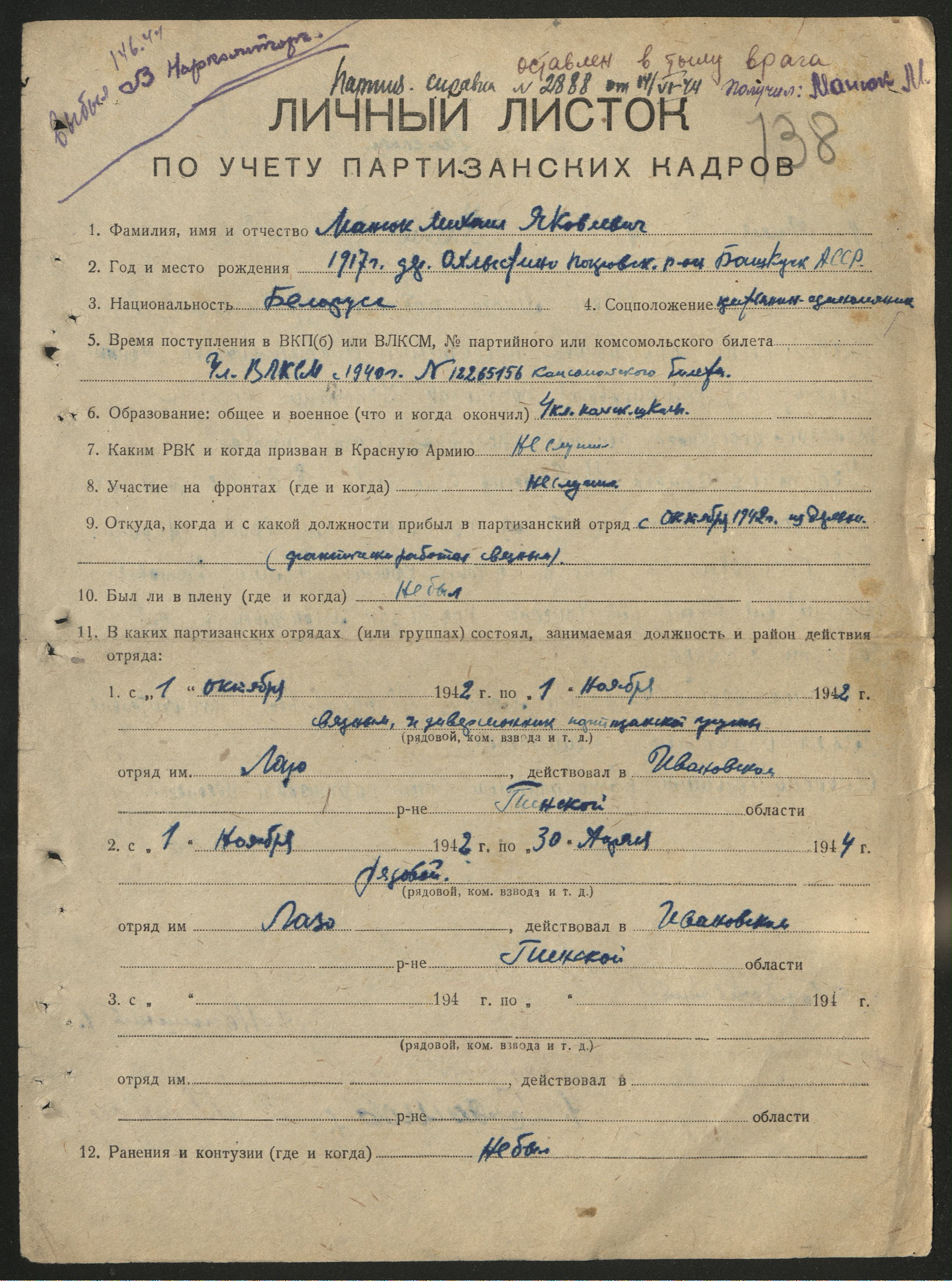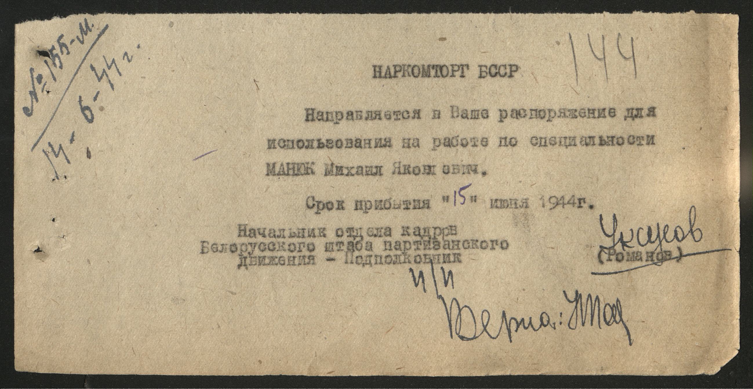 Если вы знаете о послевоенной жизни Михаила Яковлевича Манюка, его семье (возможно, жена — Лагодич Марфа Демидовна, проживала в годы войны в д.Радовня, Ивановского района Пинской области (с 1954 года входит в состав Брестской области) Белоруссиия), месте жительства после 1944 года — пожалуйста, поделитесь информацией с создателями базы данных «Фронт в тылу врага» по почте: info@partizany-bassr.ru либо в комментариях к этой публикации.