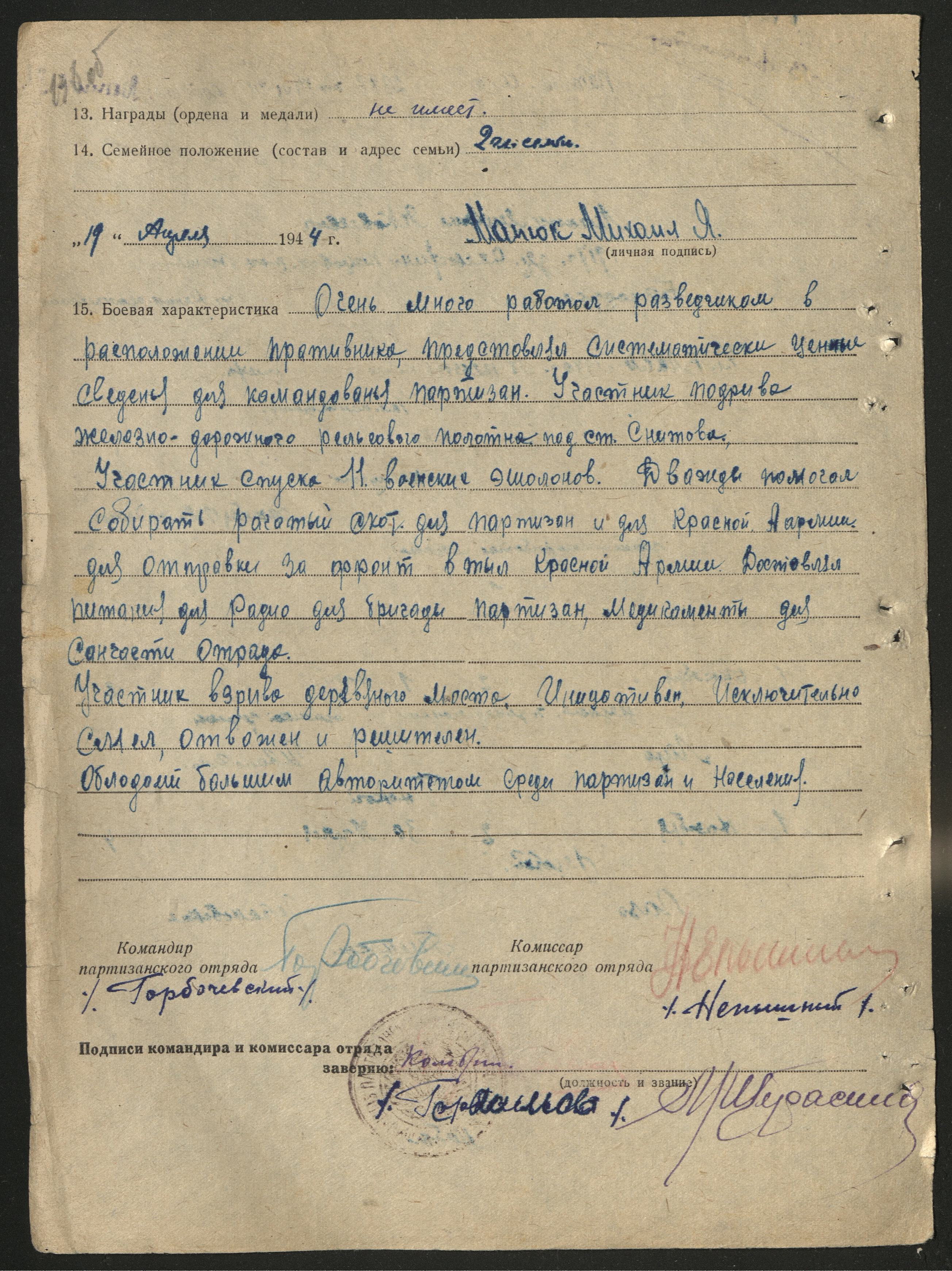 В боевой характеристике от 19 апреля 1944 года командир и комиссар отряда писали: «Очень много работал разведчиком в расположении противника… Участник подрыва ж/д полотна под ст. Снитова. Участник спуска 11 воинских эшелонов. Дважды помогал собирать рогатый скот для партизан и Красной Армии… Доставлял питание для радио бригады, медикаменты для санчасти. Участник взрыва деревянного моста. Инициативен. Исключительно смел, отважен и решителен. Обладает большим авторитетом среди партизан и населения».
