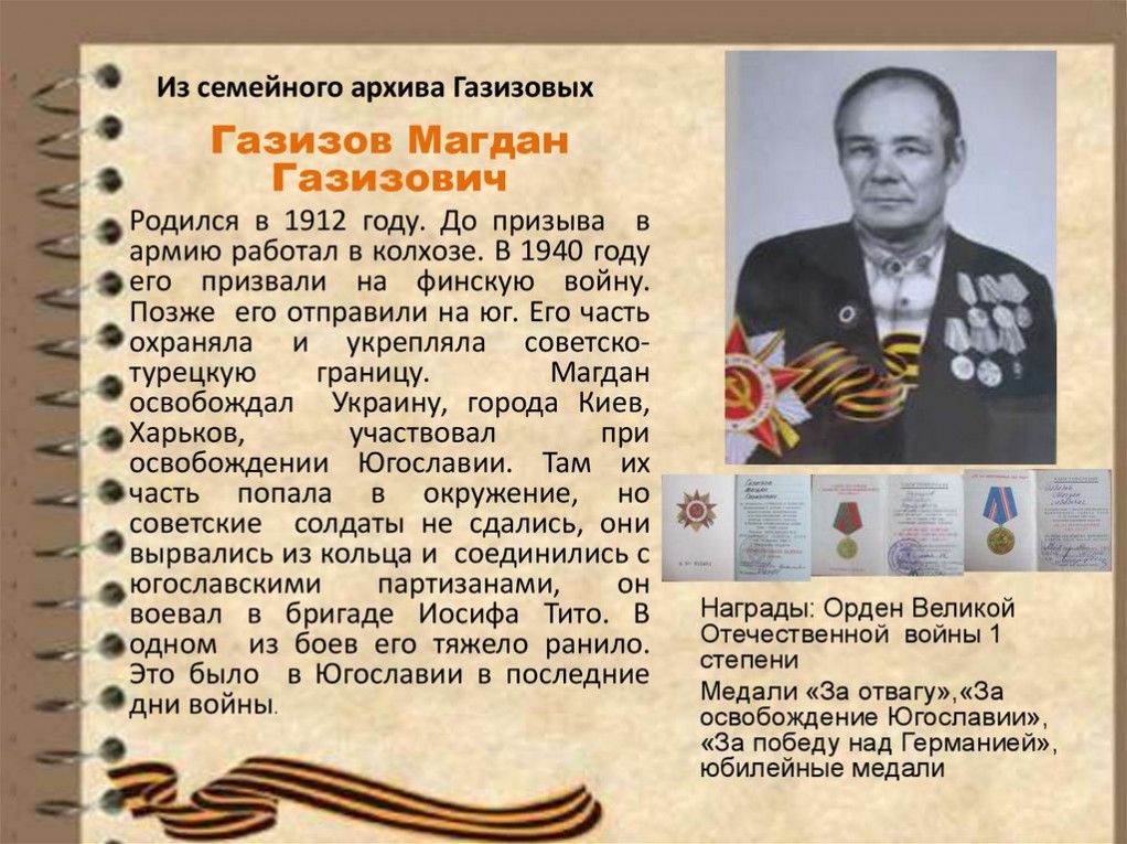 Учителем школы д. Саузбаш Краснокамского района Республики Башкортостан Анфисой Миникаевой представлена информация о земляке - участнике антифашистского Народно-освободительного движения Югославии Магдане Газизове.