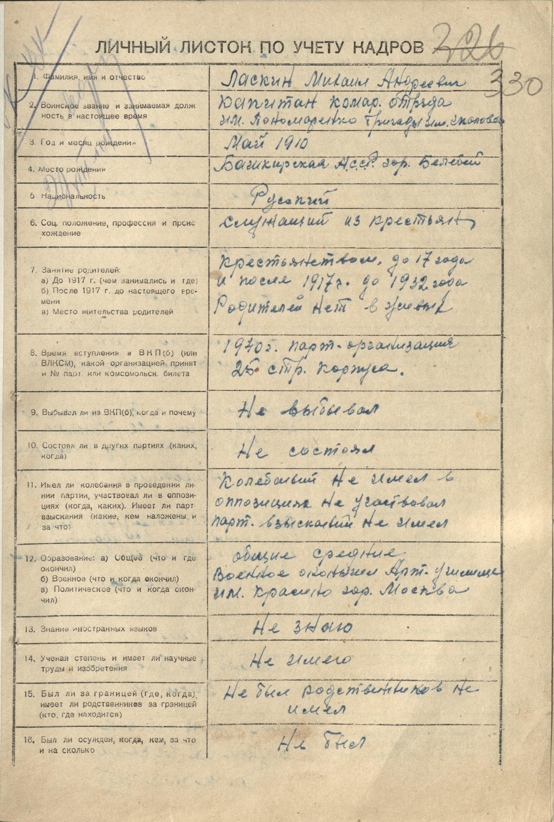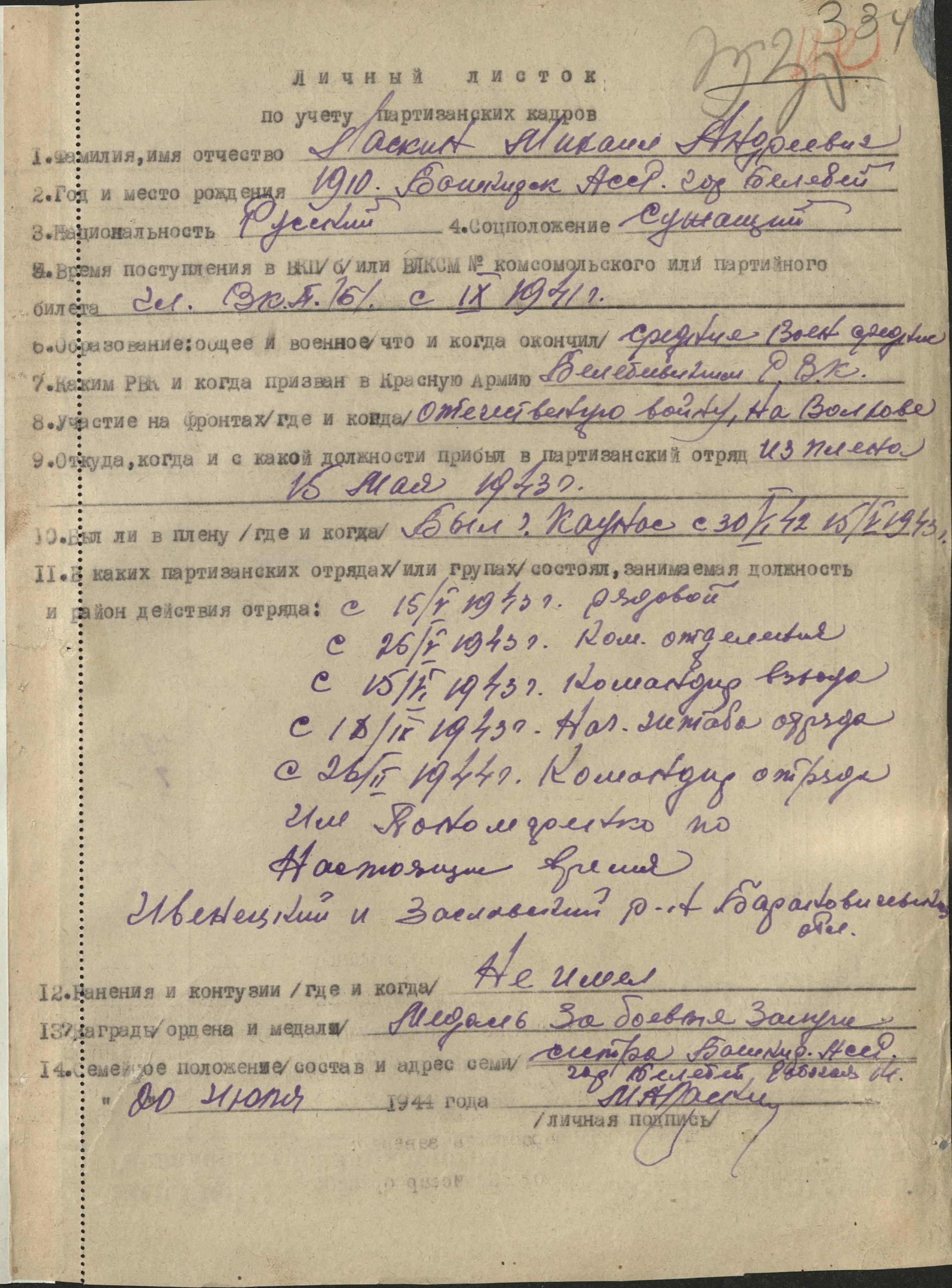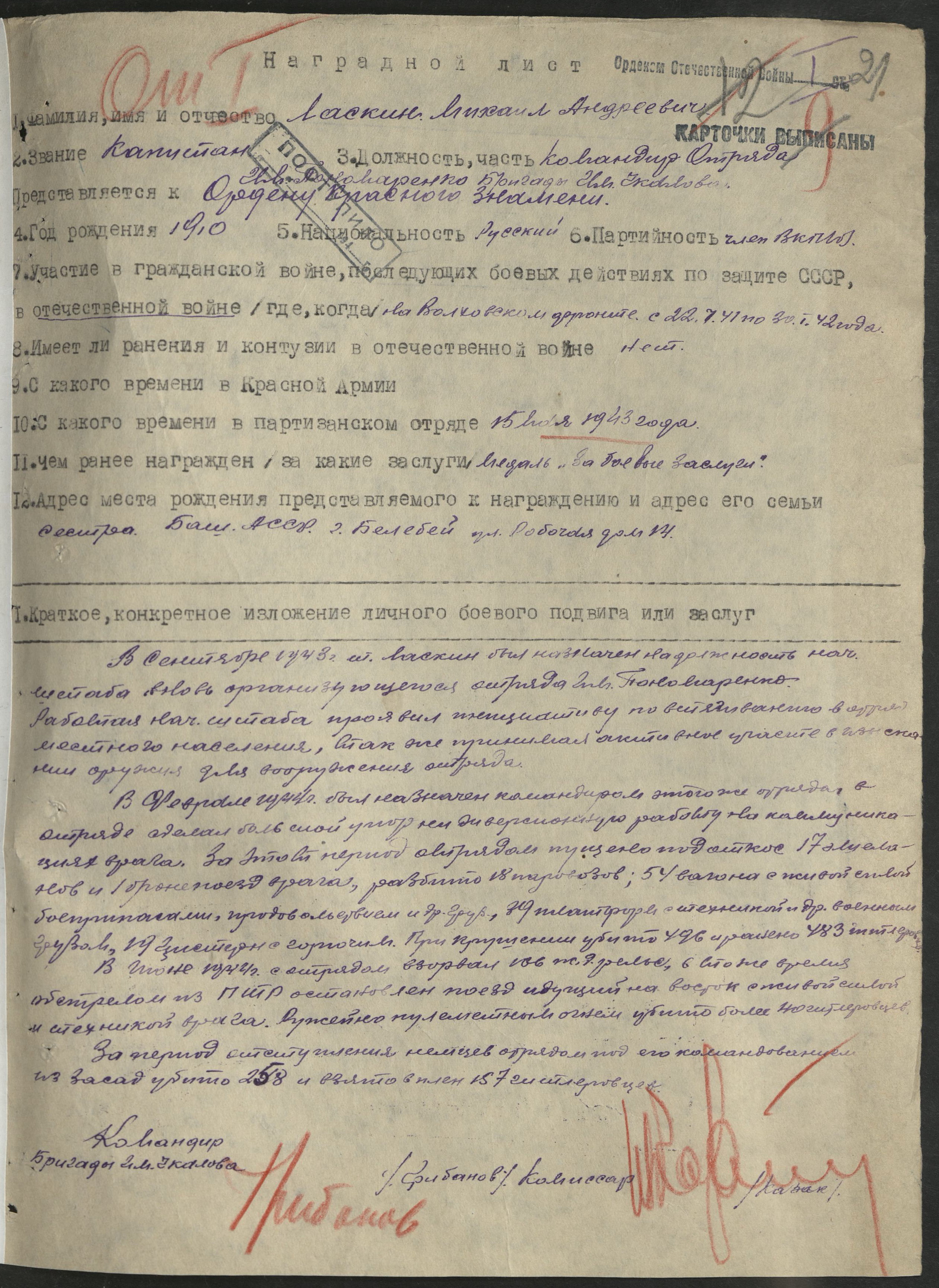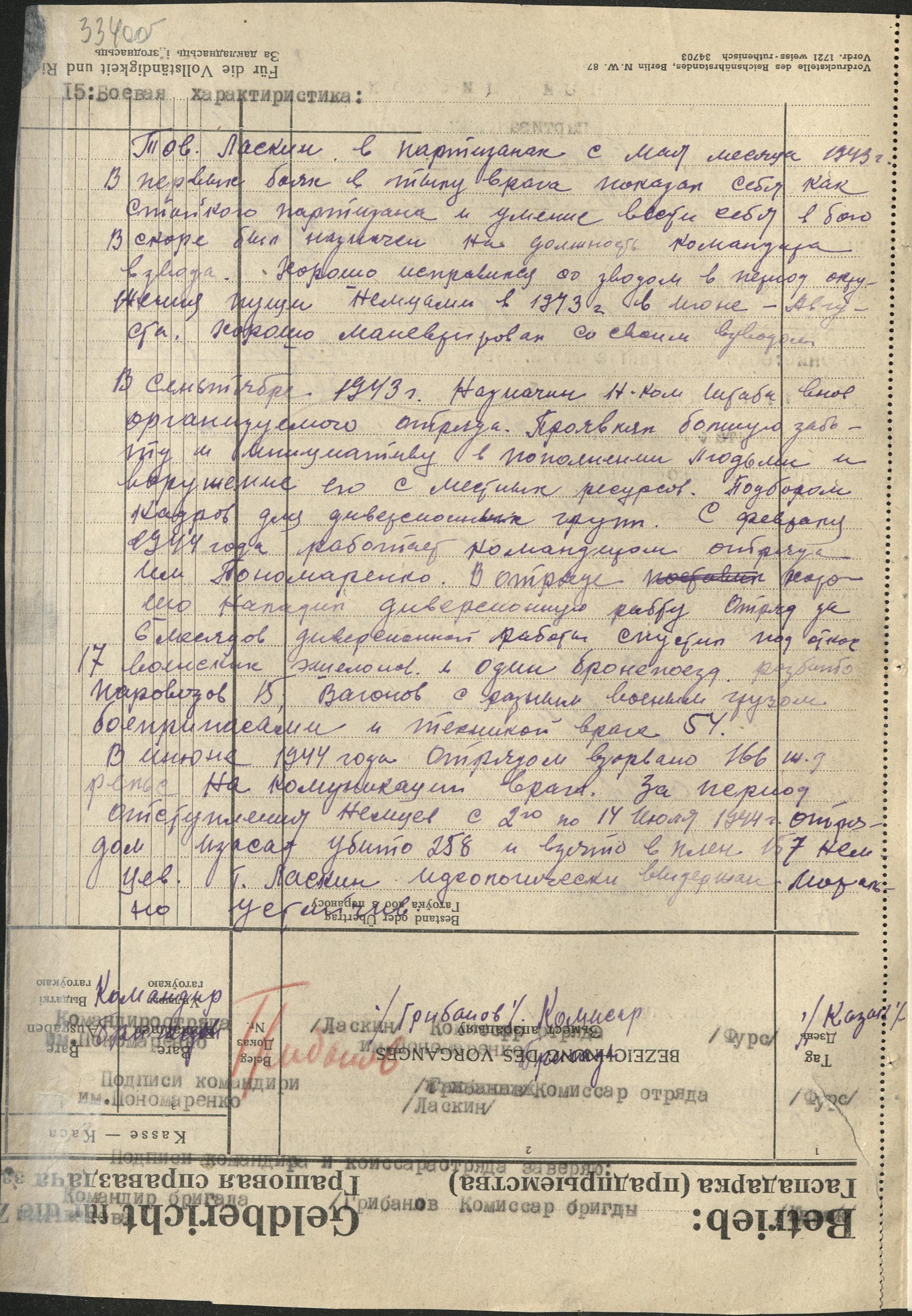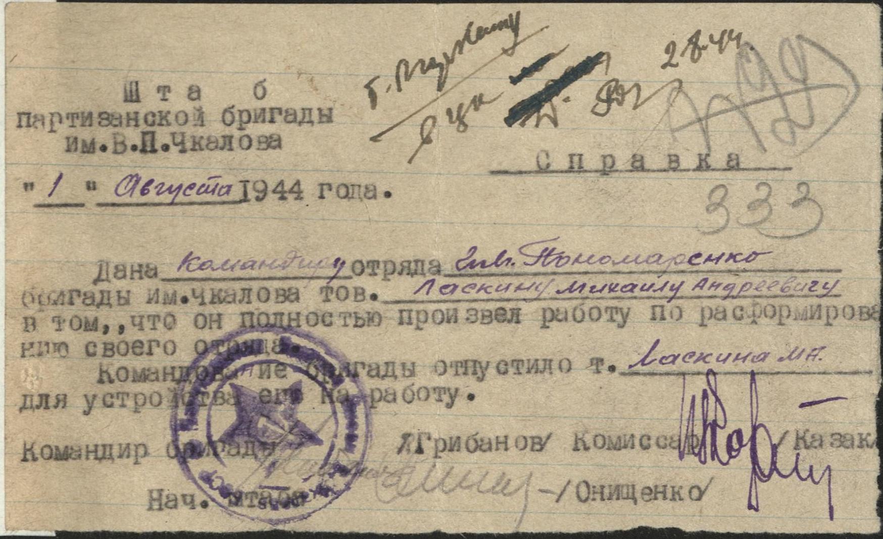 Ласкин Михаил Андреевич занимался расформированием своего отряда и 1 августа 1944 г. и командиром бригады Грибановым справкой подтверждено завершение работы.