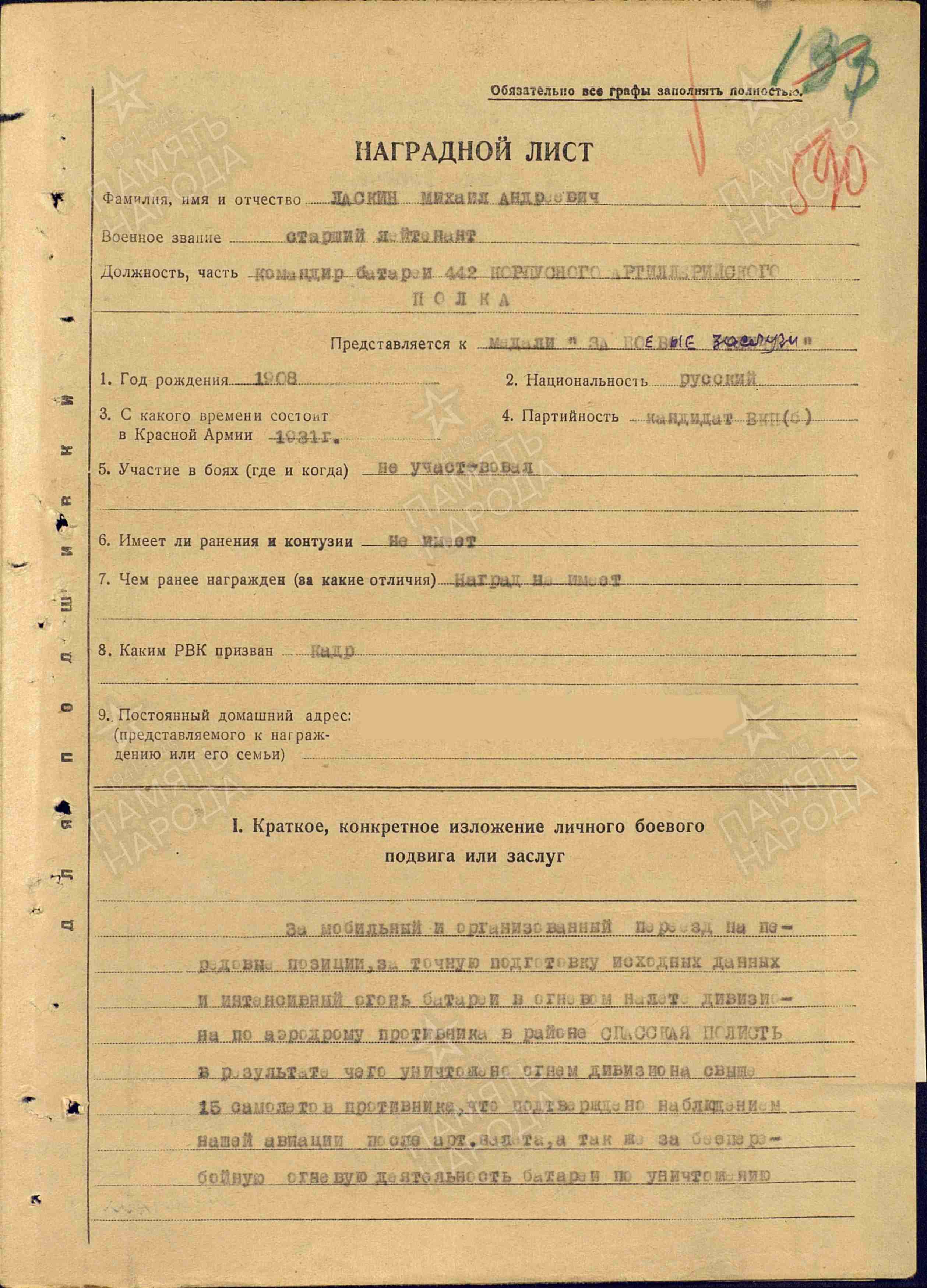 С ноября 1941 г. по февраль 1942 г. зам.командира дивизиона 442 А.П.Р.Г.К. 27 декабря 1941 г. награжден медалью «За боевые заслуги». В наградном документе говорится: “За мобильный и организованный переезд на передовые позиции, за точную подготовку исходных данных и интенсивный огонь батареи в огневом налете дивизиона по аэродрому противника в районе Спасская Полисть в результате чего уничтожено огнем дивизиона свыше 15 самолетов противника, что подтверждено наблюдением нашей авиации после артналета, а также за бесперебойную огневую деятельность батареи.”