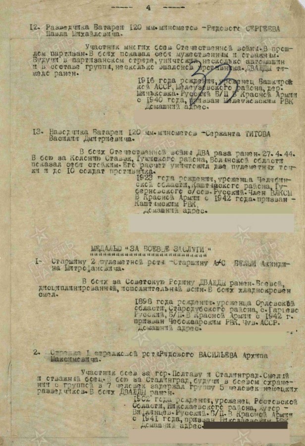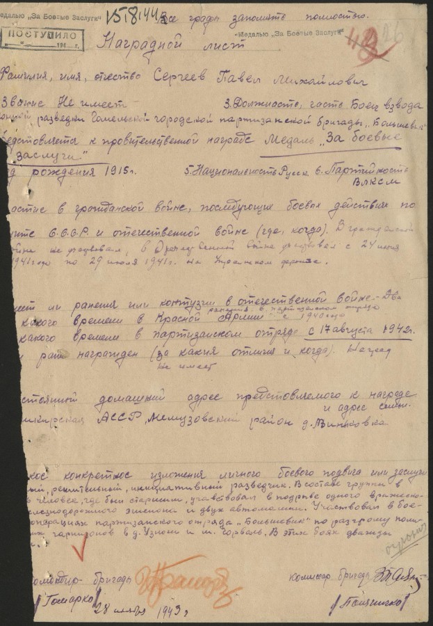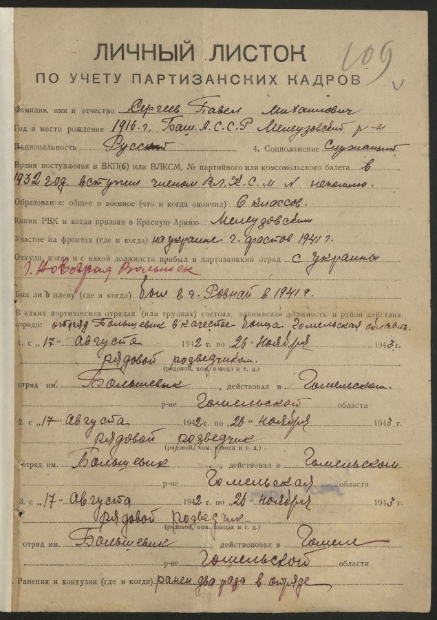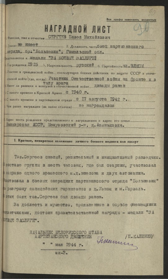 В архивных документах Белорусского штаба партизанского движения сохранился наградной лист уроженца Башкортостана Павла Михайловича Сергеева. Отважный боец - разведчик воевал в партизанском отряде “Большевик” Гомельской области. После войны солдат вернулся в родную деревню, но в книге “Память. Башкортостан” до сих пор считается пропавшим без вести.